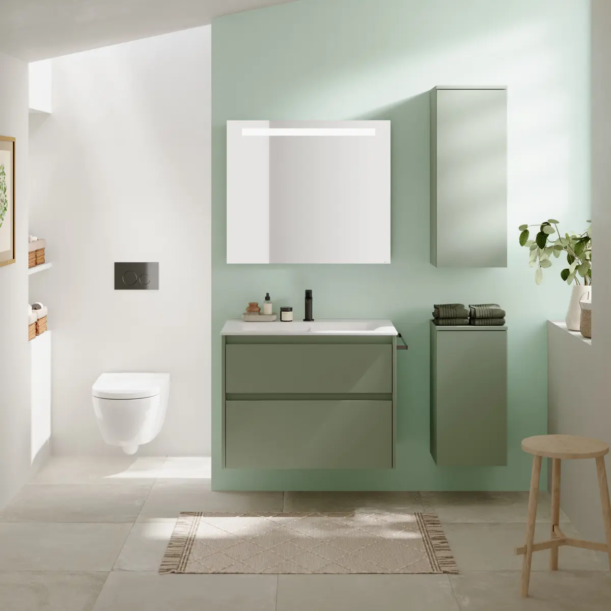 Die aktualisierten Badmöbel der Serie Renova Plan präsentieren sich mit klarer Linienführung, versenkten Griffen und ruhigen Fronten. Schränke und Seitenschränke sind künftig in sieben Farben und Oberflächen erhältlich. Neben Weiß seidenglanz ergänzen seidenmatte Varianten in Weiß, Sandgrau und dem aktuellen Farbton Salbeigrün das Sortiment. Hinzu kommen Lava seidenmatt sowie zwei Holzdekore in Nussbaum hickory und Eiche natur. Alle seidenmatten Ausführungen sind mit einer Anti-Fingerprint-Beschichtung versehen, die den Reinigungsaufwand reduziert und die Pflege erleichtert. Kratzfeste Oberflächen und hochwertige Materialien sorgen für eine lange Lebensdauer im täglichen Gebrauch.