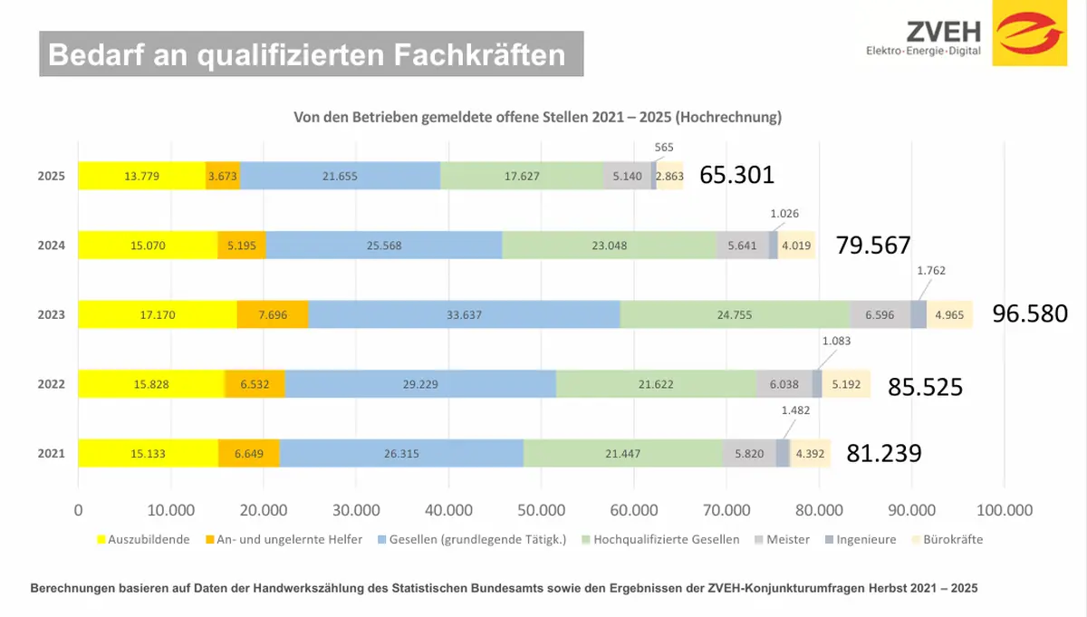 Die E-Handwerke in Deutschland verzeichnen aktuell rund 65.000 offene Stellen – 18 Prozent weniger als im Vorjahr. Damit setzt sich der rückläufige Trend beim Fachkräftebedarf fort, der bereits in den letzten beiden Jahren zu beobachten war. Besonders betroffen sind an- und ungelernte Helfer, während der Bedarf an qualifizierten Gesellen, hochqualifizierten Gesellen und Meistern nur moderat zurückgeht. Hintergrund sind anhaltende Krisen im Neubau, niedrige Sanierungsraten und eine stagnierende Energiewende. Trotz des Rückgangs warnt der Zentralverband der Deutschen Elektro- und Informationstechnischen Handwerke (ZVEH), dass Fachkräfte weiterhin dringend benötigt werden, insbesondere angesichts der demografischen Entwicklung und der fortschreitenden Elektrifizierung.